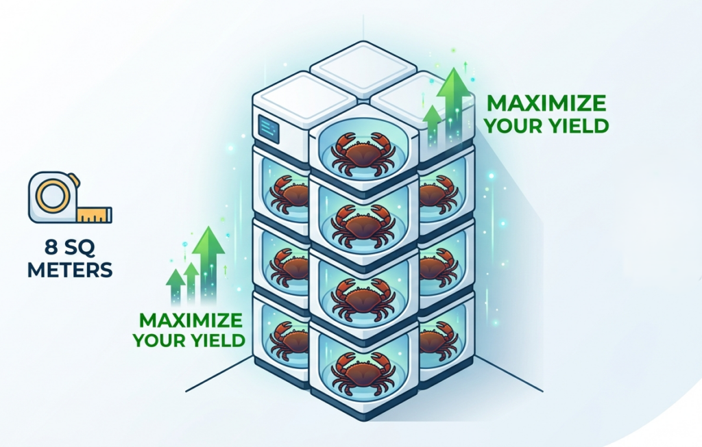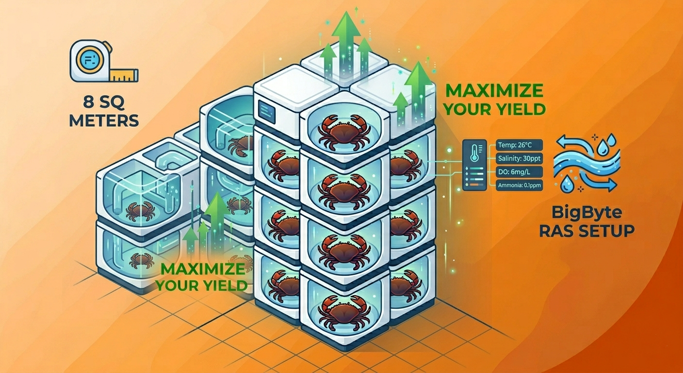 Vertical crab farming is revolutionizing the way we think about aquaculture, proving that you don’t need hectares of land to build a profitable empire. At BigByte Aqua Ventures, we are leading this shift by showing that the future of farming isn’t about how much land you own and it’s about how smartly you use it. With our advanced Recirculating Aquaculture System (RAS), you can launch a high-income farm in an area as small as 8 square meters.